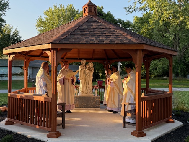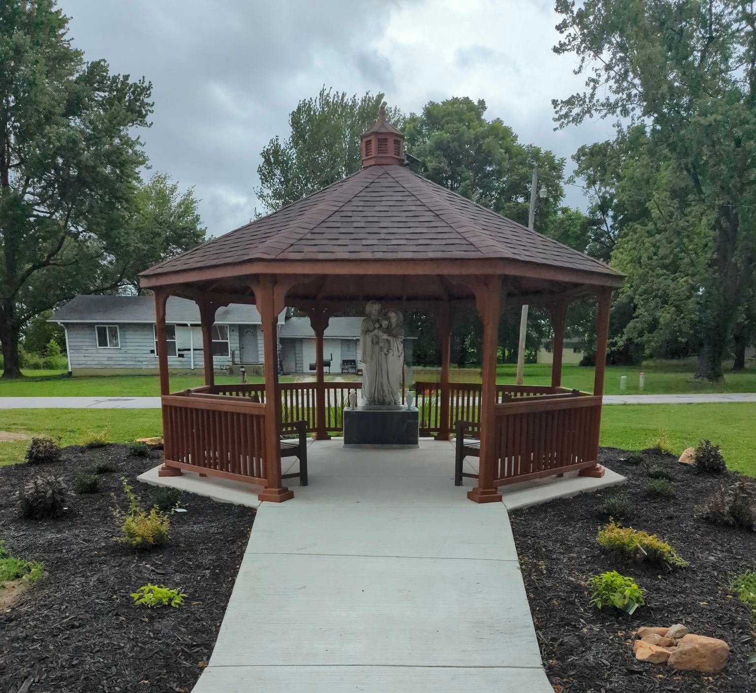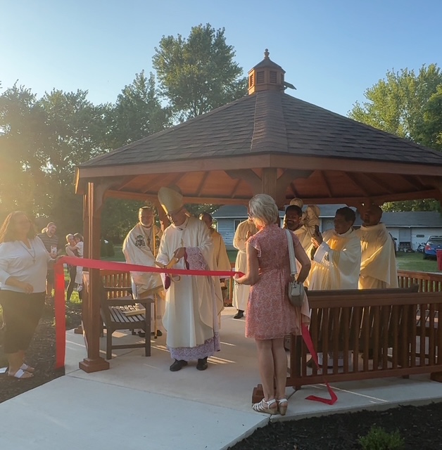 The Holy Family Prayer Garden encompasses a half-acre greenspace featuring the focal point of the garden, the beautiful 59″ statue of the Holy Family on a marble pedestal under the protective cover of a 16′ pine gazebo. Garden benches allow for comfortable seating for prayer, reflection, and relaxation. The concrete pathway leading to the gazebo is fully wheelchair accessible. Solar lighting illuminates the Holy Family statue from dusk til dawn.