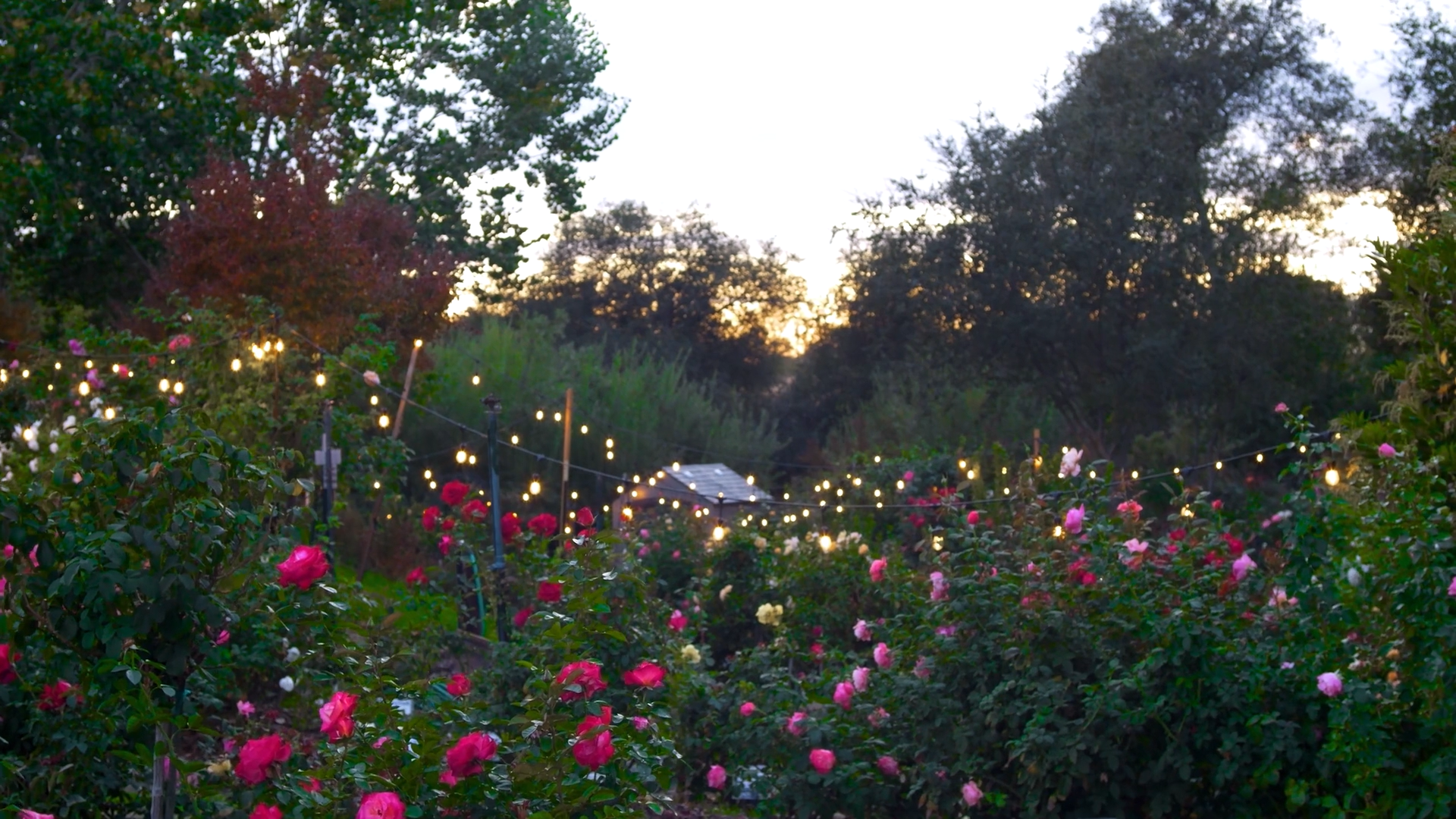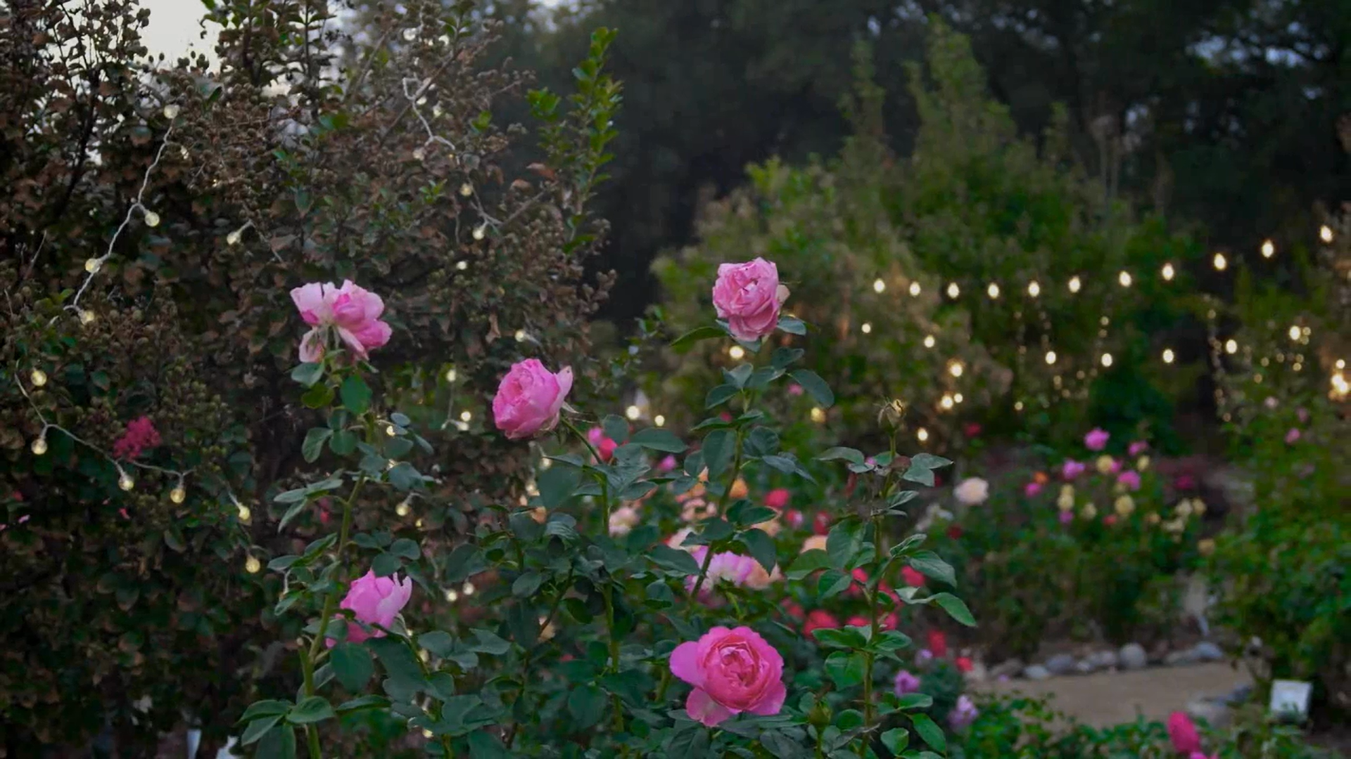 Primarily roses, also a variety of trees including red maples and Japanese maples, camillas, hydranges, azaleas, dogwoods, chrysanthemums, geraniums, salvia, marigolds, succulents and others.