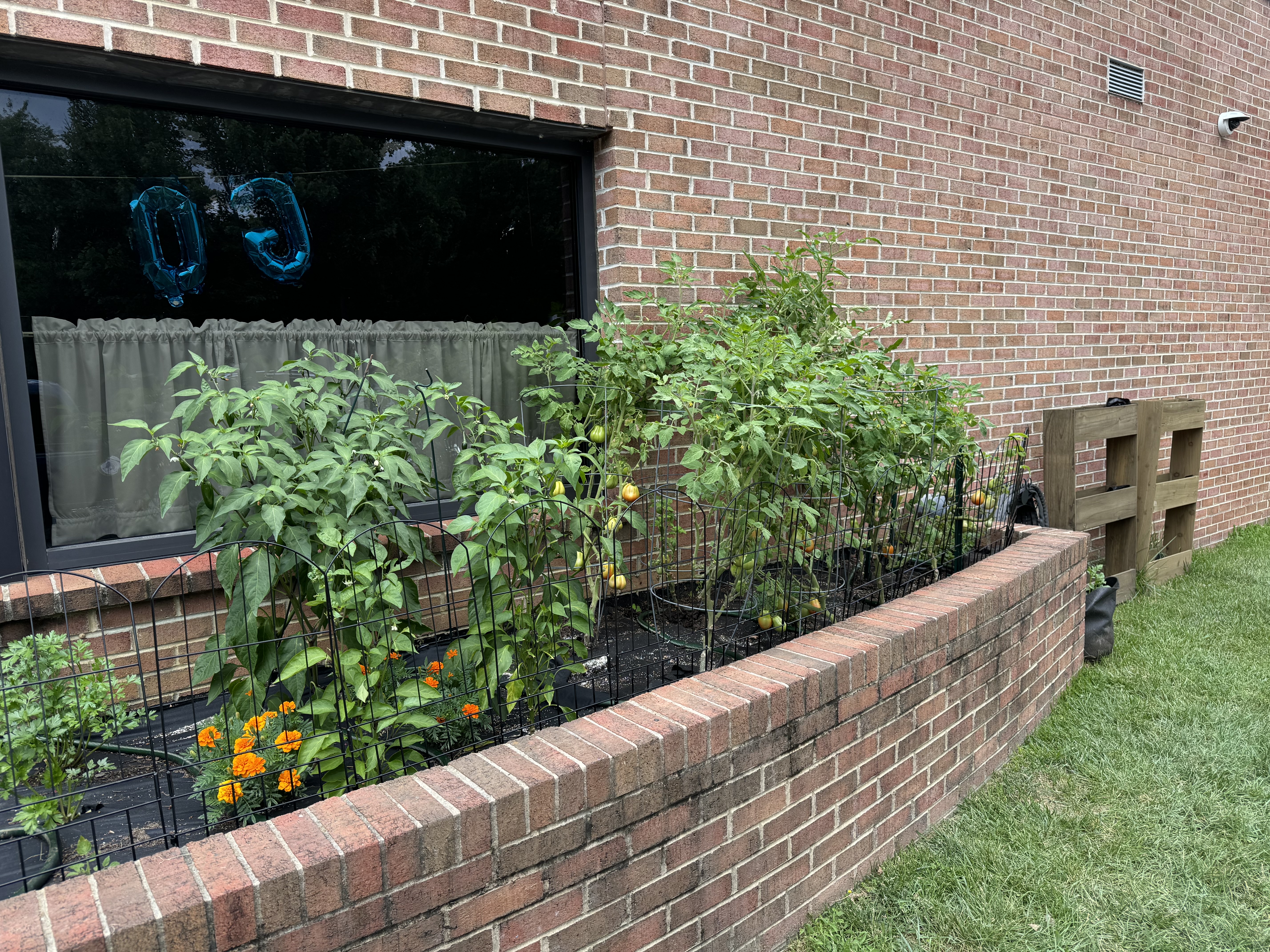 Our garden is made up of mostly vegetables and herbs. We grow tomatoes, green peppers, jalapeno peppers, red onions, eggplant, beans, and various leafy greens. In addition, we have basil, sage, mint, rosemary and parsley. We also grow specific flowers that act as natural pest control. Some varieties are chosen to repel harmful insects, while others are planted to attract beneficial pollinators and "good bugs" that help our vegetables thrive. Our flowers include zinnias, marigolds, poppies, coneflowers, coreopsis and sunflowers.