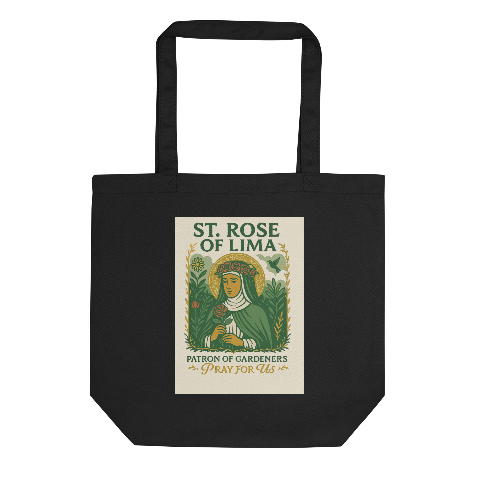 This organic cotton tote features St. Rose of Lima, patron saint of gardeners, and is perfect for harvest days, flower picking, or trips to the farmers’ market. Durable, spacious, and sustainably made—it’s a lovely way to bring a bit of the garden and saintly inspiration wherever you go.